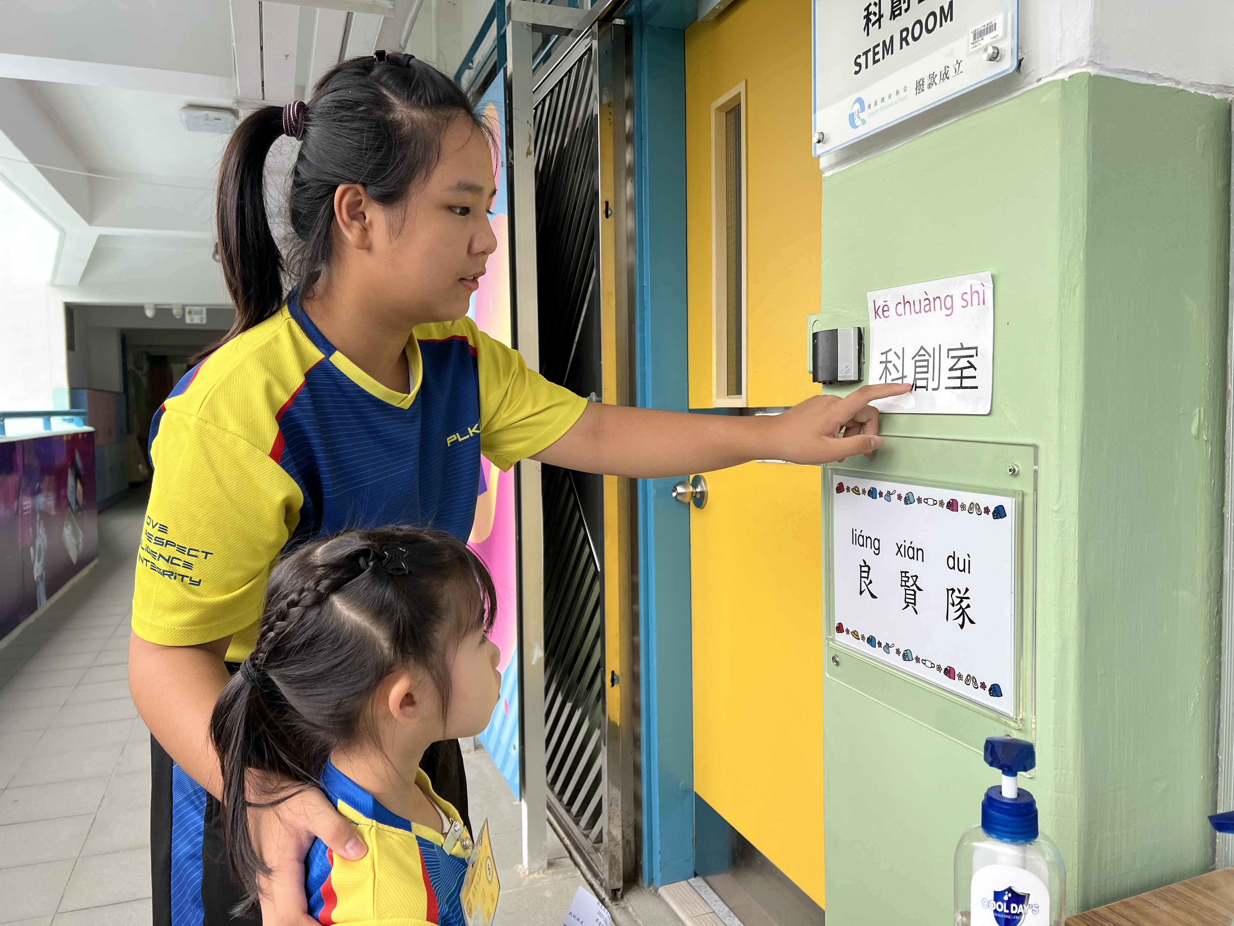 六年級學姐在「六帶一校園普通話導賞」中,耐心地教一年級學妹用普通話讀學校的設施 |