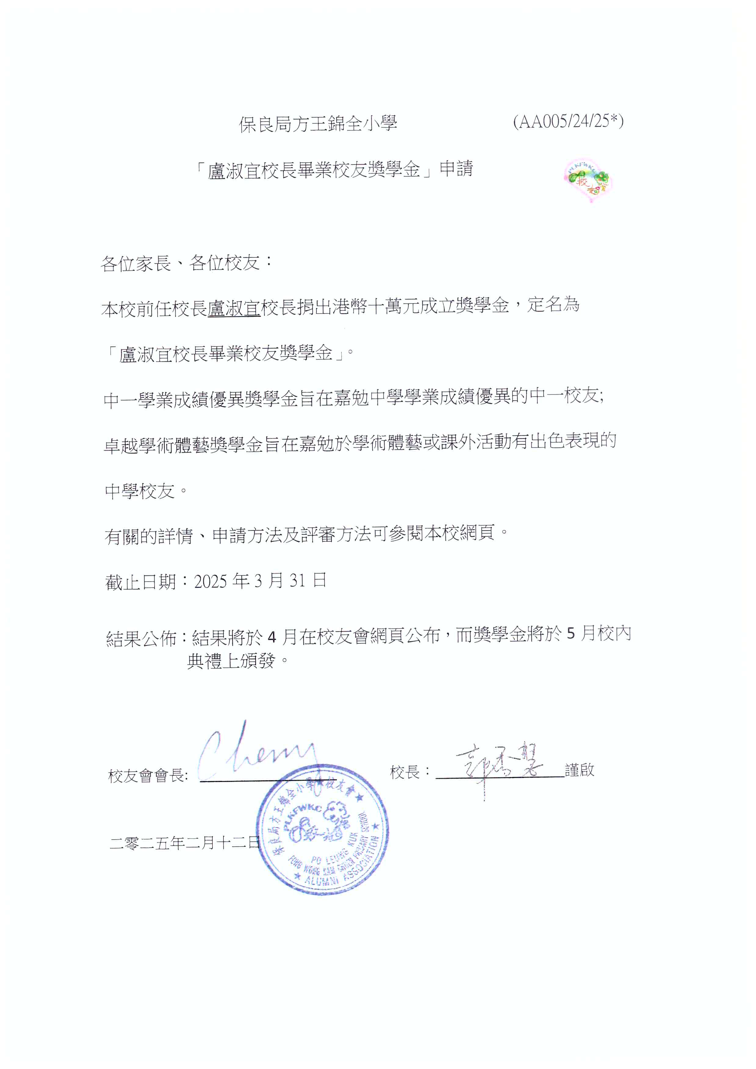 盧淑宜校長畢業校友獎學金申請