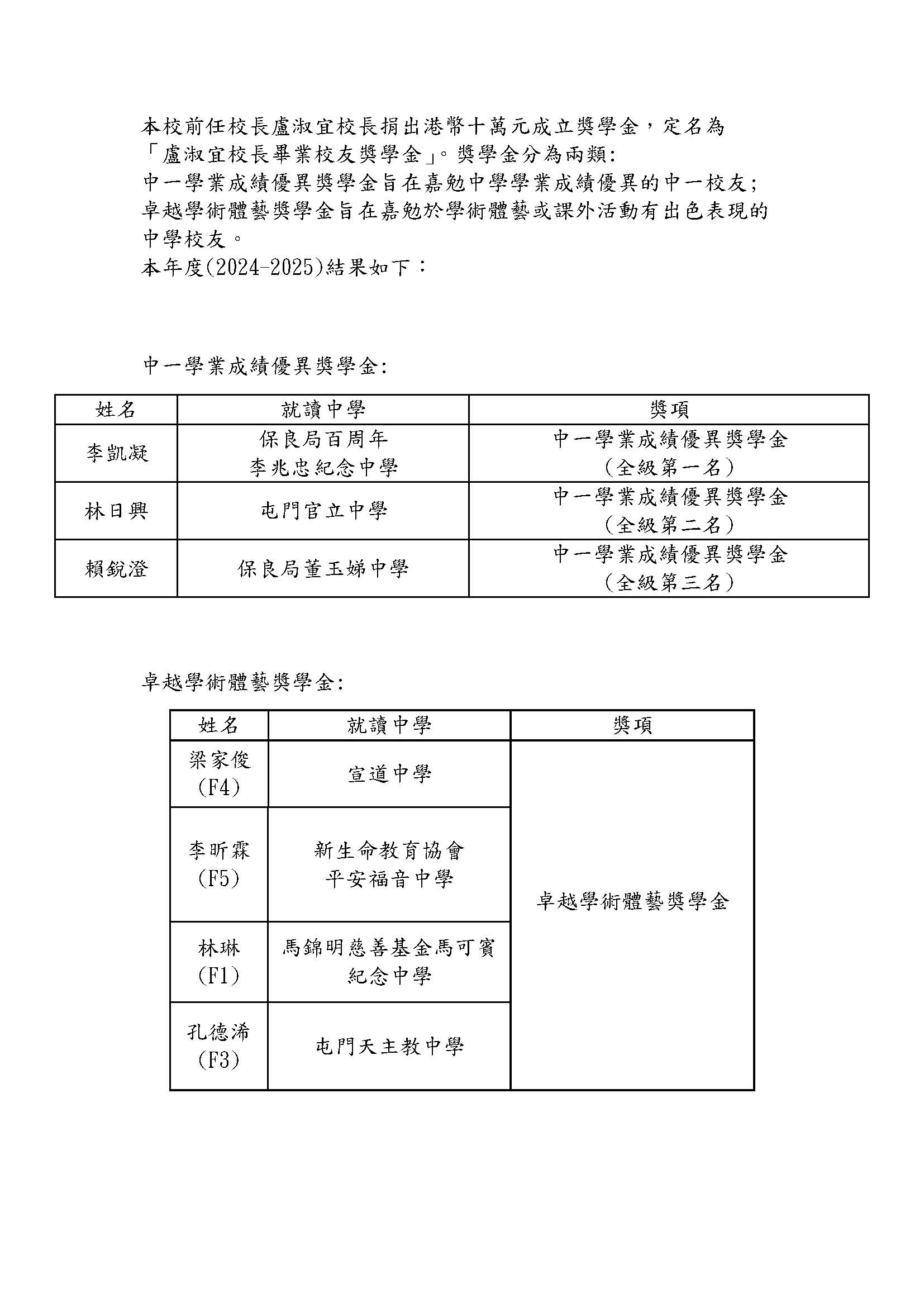 24-25年度「盧淑宜校長畢業校友獎學金」得獎結果